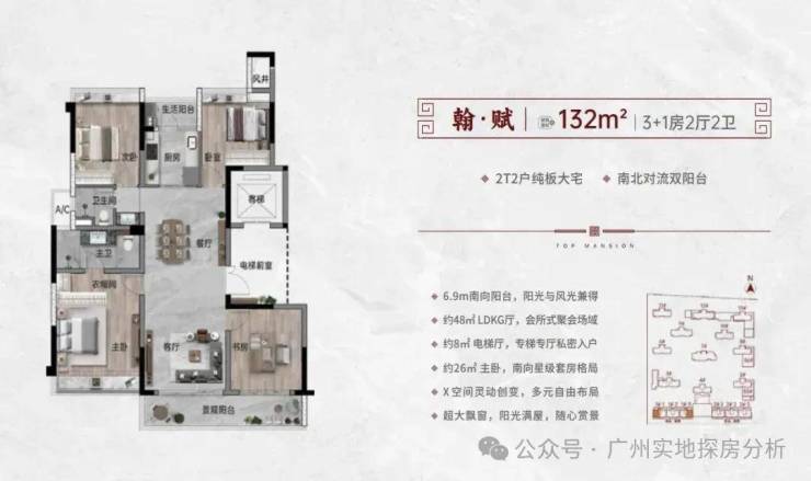 132m²3+1房2卫,2T2户纯板大宅 | 南北对流双阳台 | 南面约6.9米全屏观景阳台。