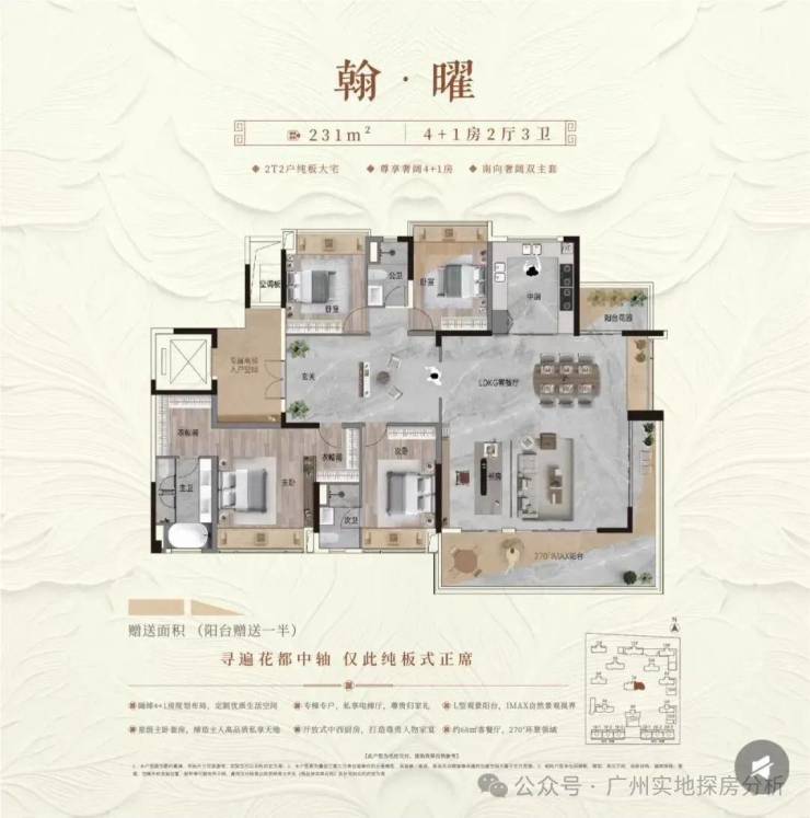 172m² 3+1房3卫,南北对流双阳台 |南向奢阔双主套 | 4开间朝南约17.5米全面屏采光 | 270°环幕大视野。