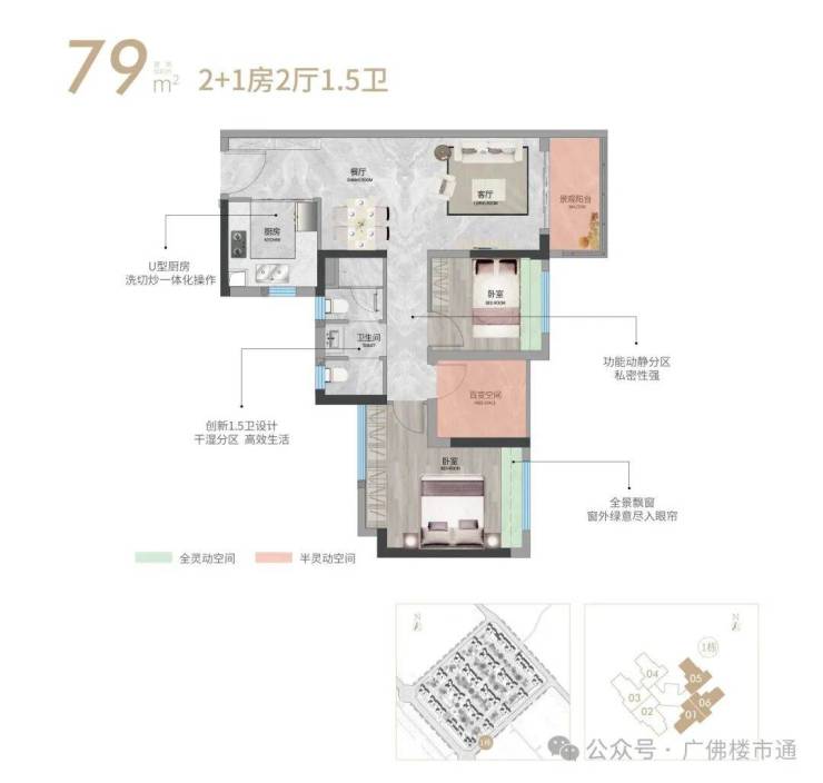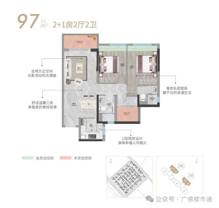 全明方正竖向双厅,U型厨房更多储藏空间,私享套卧浪漫生活