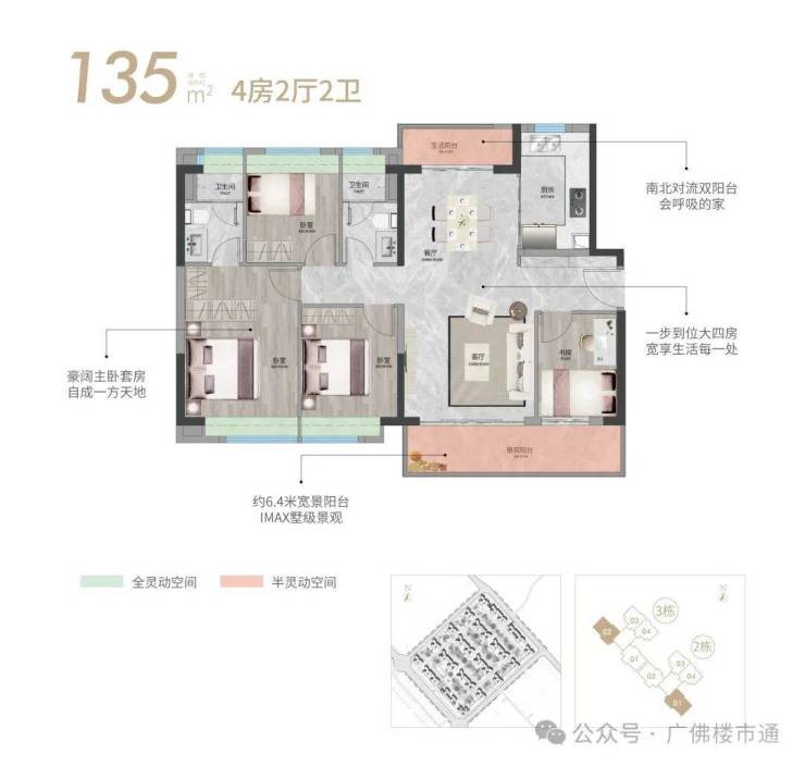 约6.4米墅景阳台+双阳台+阔绰双厅南北通透,四开间朝南,套房式主卧更多生活仪式感