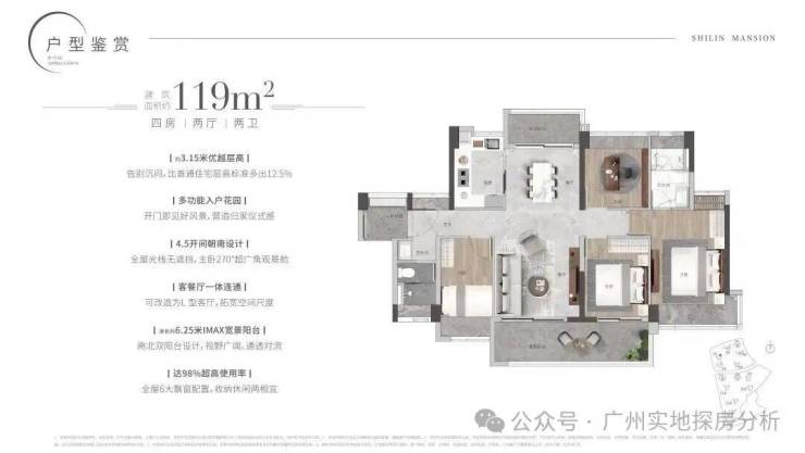 约3.15米优越层高,四开间朝南设计,主卧270°超广角观景舱,净长约6.15米IMAX宽景阳台,南北双阳台设计,通透对流,达98%超高使用率长岭居首个约80cm飘窗产品,全屋8大飘窗。