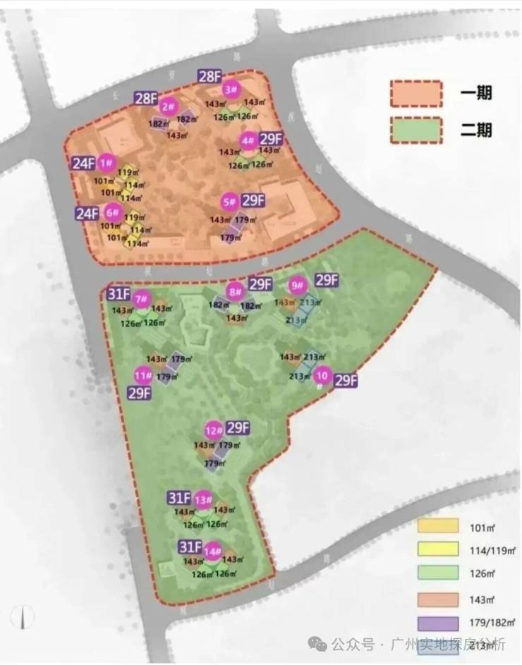 一共规划了14栋住宅,分南北地块开发。