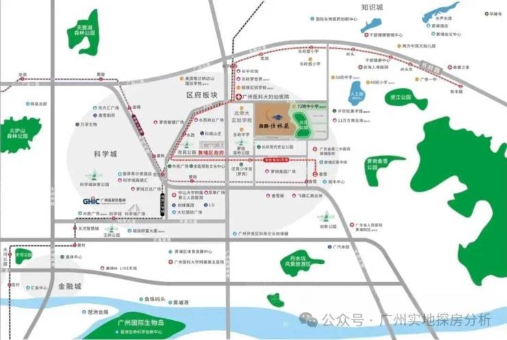 核心优势:项目位于科学城核心区,距地铁6号线苏元站约1公里,未来23号线(规划中)可能在附近设站。对口科学城小学、玉岩中学等优质教育资源。周边有万达广场、锐丰中心、大壮国际广场等大型商业配套。紧邻科学城体育公园、尖峰岭公园,享稀缺生态资源。项目主打科学城核心区高品质宜居社区。