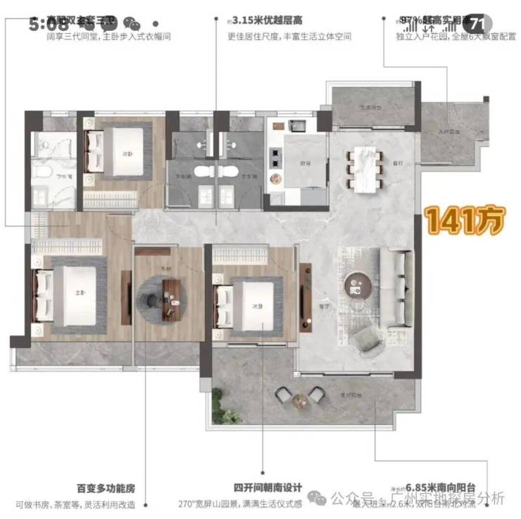 约3.3米墅级层高,高配双主套三卫,五开间全朝南,主卧客厅双270°转角,净长约6.3米巨幕山景阳台,最大净进深约2.2米,实用率高达97% 带花池入户花园,全屋6大飘窗配置。