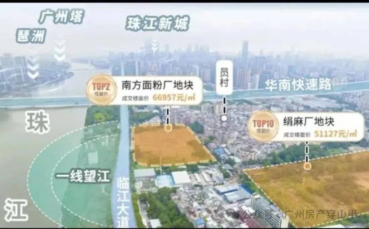 面粉厂地块位于临江大道旁,与珠城直线距离仅约600m;隔着净水厂,就是广州豪宅标杆汇悦台,二手成交单价一度超30万/平。