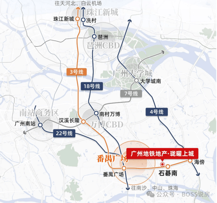 距3 号线石碁南站约 500 米,2 站到番禺广场,3 站万博 CBD,5 站珠江新城,半小时可连接市中心,一小时畅行湾区;