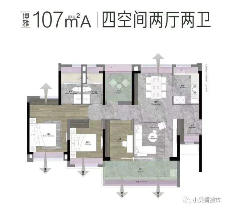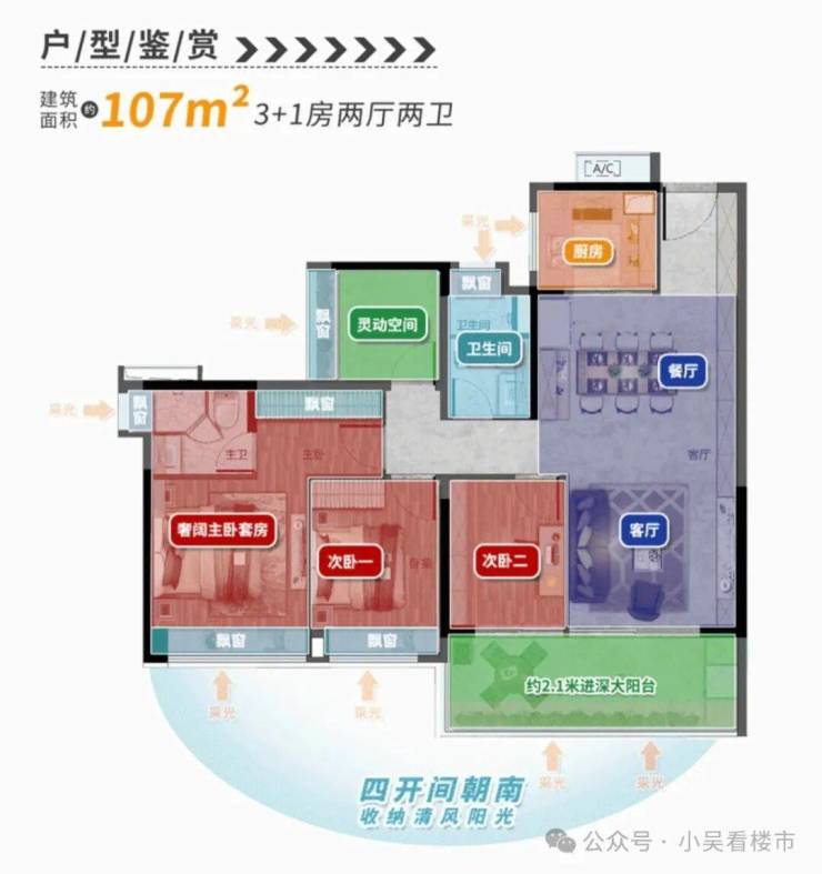 建面107平四房两卫,分为A-B两种户型,四开间朝南,开间达5.9米,动静分区,约5.9-6.1米景观阳台,总价330-360万左右。