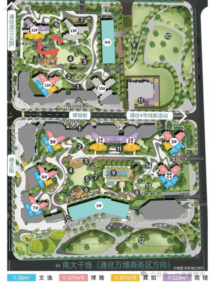 小区采用围合式布局设计,目前在售户型为88-125平三四房,主要为一期部分楼栋的尾货,还有二期的11-12栋,其中12栋今年10月份就能收楼。