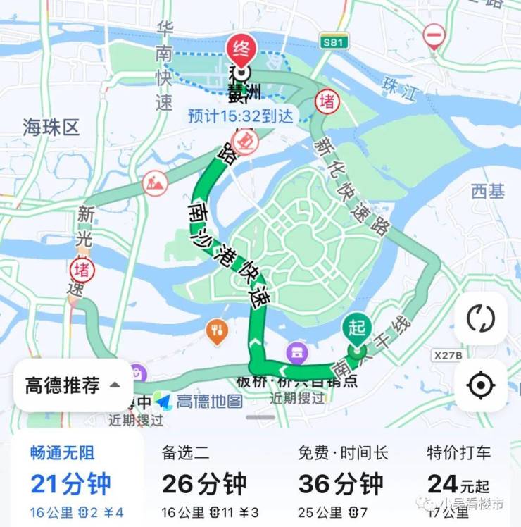自驾去琶洲:出来走南大干线,再转南沙港快速,到科韵路,全长16公里到琶洲,耗时21分钟左右。