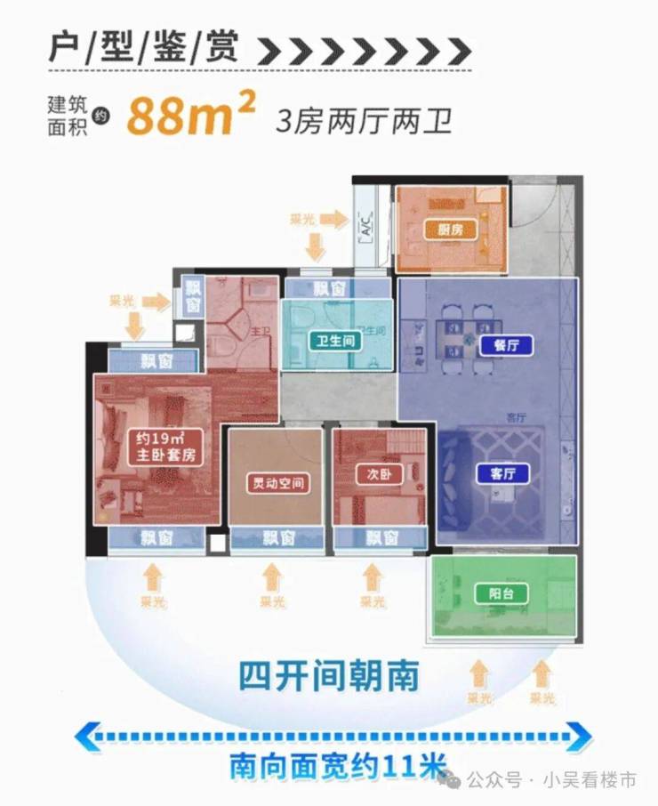 建面88平三房两卫,朝向南,经典竖厅户型,客厅长达10米的收纳柜,可作为书柜,还能摆上各种其它东西,主卧带套房设计,总价260-300万左右。