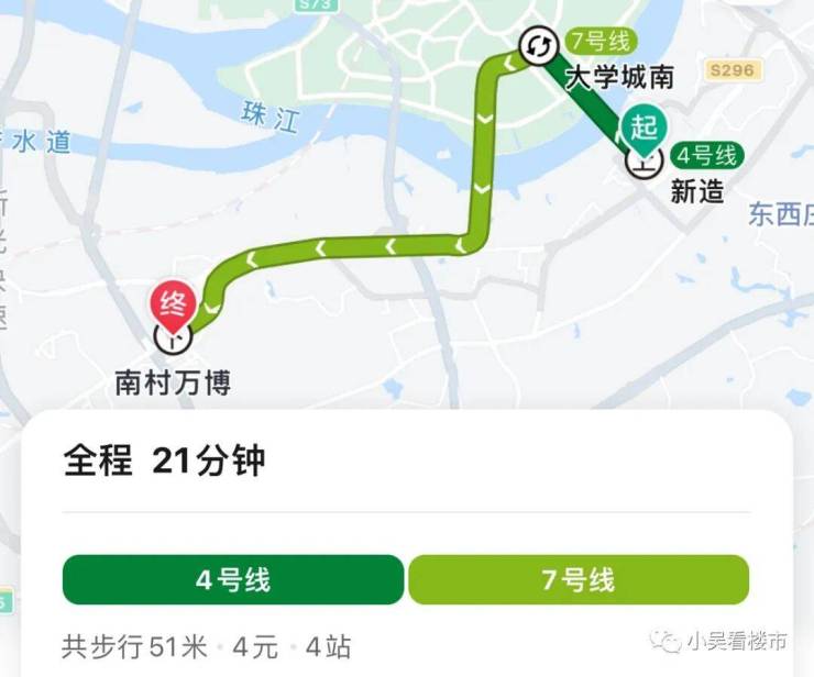地铁前往万博:步行至地铁新造站约13分钟,乘坐4号线到大学城南换乘7号线,全程3个站,总共耗时34分钟左右。