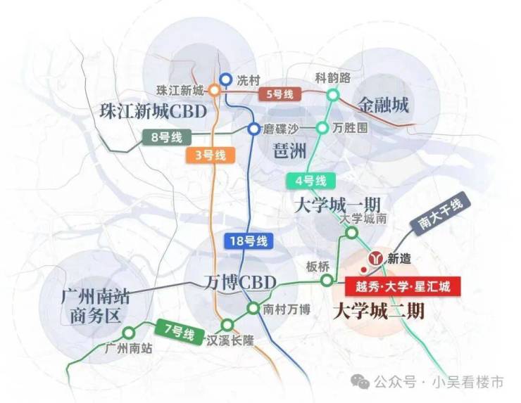整体来看,大学星汇城的交通还是挺不错的,乘坐地铁去往万博、大学城、琶洲、金融城等地都能控制在40分钟以内,自驾时间就更短了,不堵车情况下,20分钟左右就能去到各区中心。