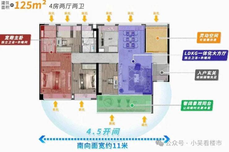 建面125平4+1房,南北对流,四开间朝南,阳台去到6.2米,采光视野都非常好,LDKB一体化设计,可打通书房做一个超大客厅。