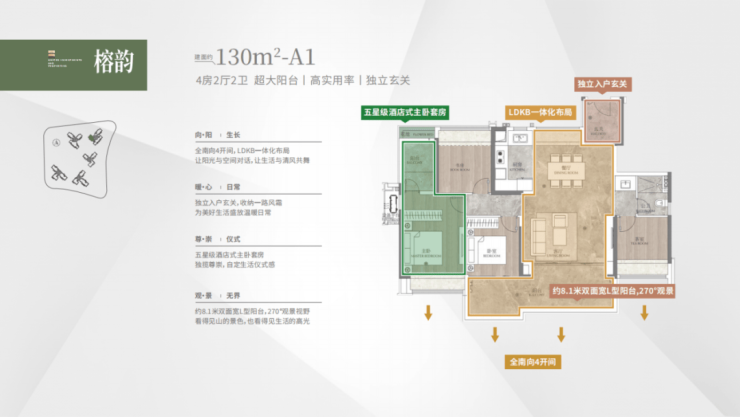 建面 165 平 4+1 房大平层,双阳台南北对流,通风顺畅。四开间朝南,中式厨房与独立西式岛台的搭配,满足不同烹饪需求。三面望山景,朝南面宽达到 17.4 米,近 9 米的 L 型景观阳台,将自然美景尽收眼底。双主套设计,保障家庭成员的私密性,主卧同样配备 270 度折叠屏飘窗,尽享舒适与奢华。
