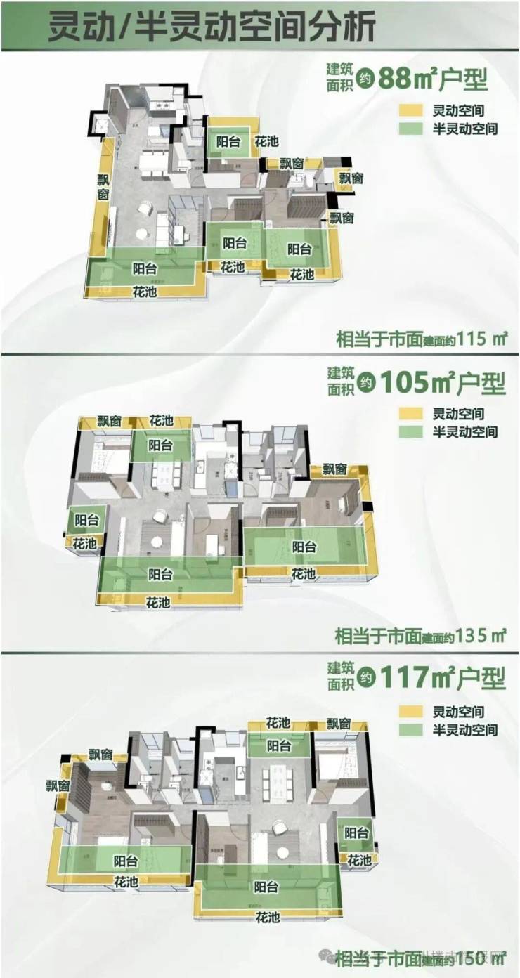 主力户型为88-105-117㎡四房,约88㎡四房、约105㎡四房,且是超新规项目,超130%的使用率,大部分房间都是阳台报建,阳台报建可以送一半,其次飘窗方面又突破上限,报80打50留30。