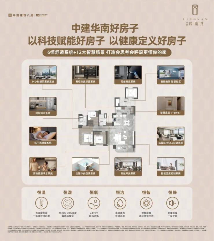 直面岭南气候与居住痛点,中建八局以科技赋能住宅,给出了“好房子”的系统性答案。依托“6恒12大科技系统”与“三大核心健康系统”,筑牢了101项基础需求的品质根基,实现了56项提升需求的舒适跨越,并圆满达成了13项独家特色需求。