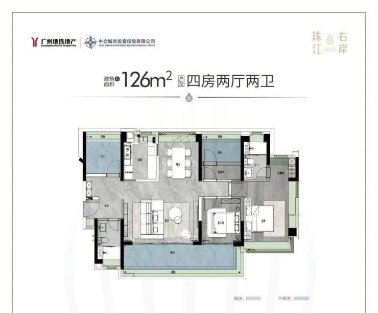建面约126平四房两卫有横厅和竖厅可选,各具特色。