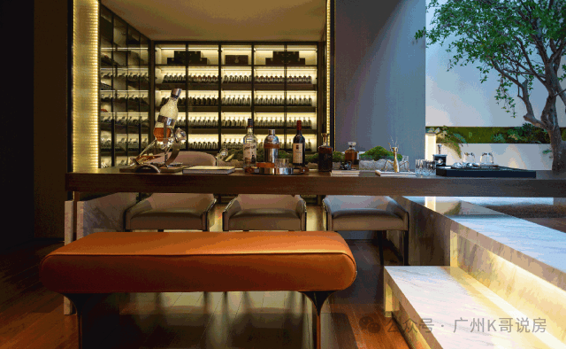 约7.3米挑高地下室,取意广州西关大屋"上观星云,下藏珍玩"的智慧:上层设茶室、书房,天光透过采光井洒落,下层藏酒窖、影音室。