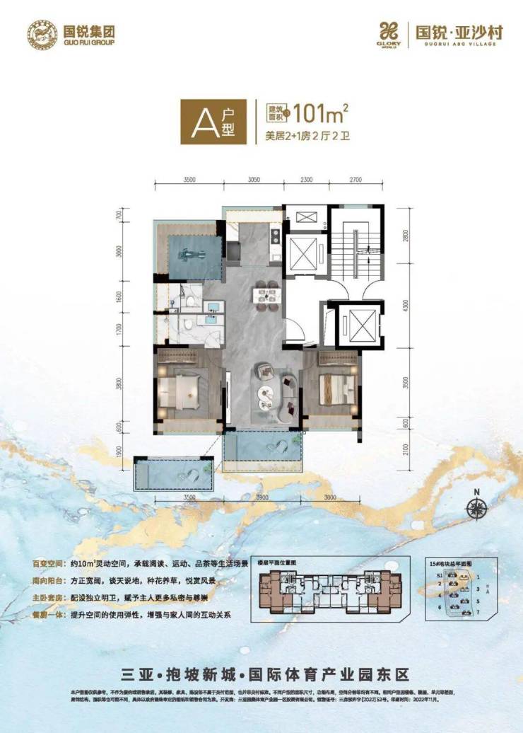 国锐・亚沙村户型多样,面积从 101 - 200㎡不等,2 + 1 房至 3 + 1 房多种布局,满足不同家庭的居住需求。所有户型均南北通透、全明设计,空间布局合理。