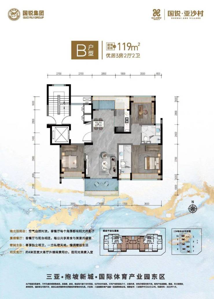 B 户型 119㎡优居 3 房两厅两卫,南北双阳台,空气对流,阳光满室;景观餐厅与阳台相连,美食美景相伴;奢阔主卧独立明卫,阳光宽厅外接阔景阳台,惬意无比。