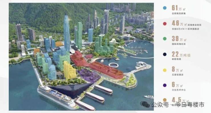 鼎级配套:约170万m²未来之城(约61万m²商务集群,含约380m超高塔尖商务总部+约46万m²滨海商业,含K11亚洲旗舰商业体、D-park等+约39万m²国际滨海社区+6万m²文化艺术中心+约8万m²五星级酒店+约4.5万m²太子湾国际学校、国际医院),一湾三坊城中城,滨海生活时代领地。