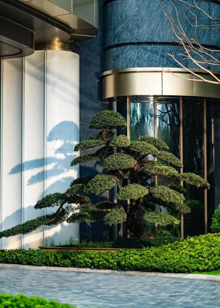 下沉庭院中,醒目挺拔的约5米迎客松,又是标志性造景。与无边界流动水系,环绕形成松风水月之景,也是岭南特色“四水归堂”中的一环。罗汉、水景、幕墙相互交融,在天井阳光下,与自然的对话,悄然发生。