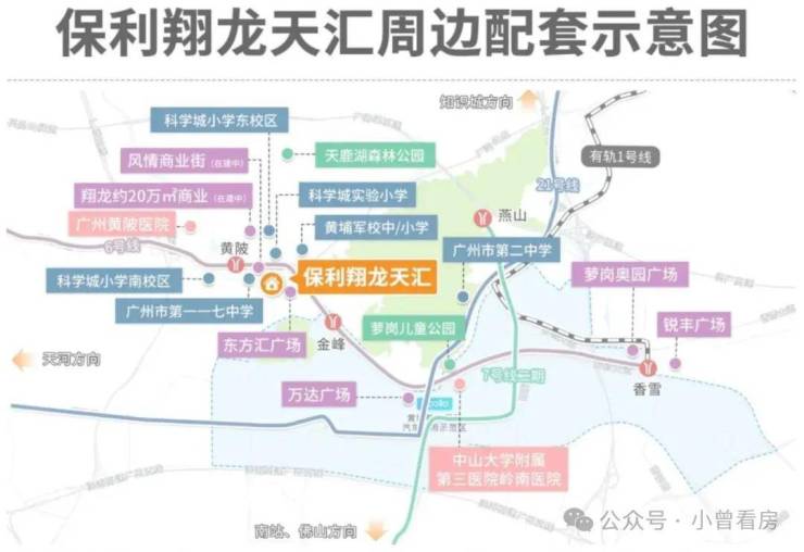 项目配建了一所24班幼儿园,中小学都是周边的,距离项目最近的是黄陂小学(去年8月更名为科学城实验小学)和黄埔军校小学,项目属于黄陂社区,按照现行政策小学预计在这两所学校中摇号。