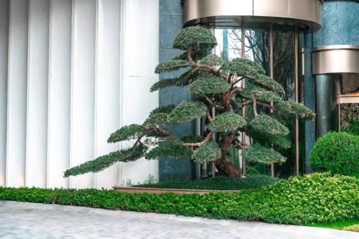 在主入口,首先映入眼帘的是高约3米的罗汉松,身姿挺拔,与两株冬青树一起,带来第一重归家仪式。