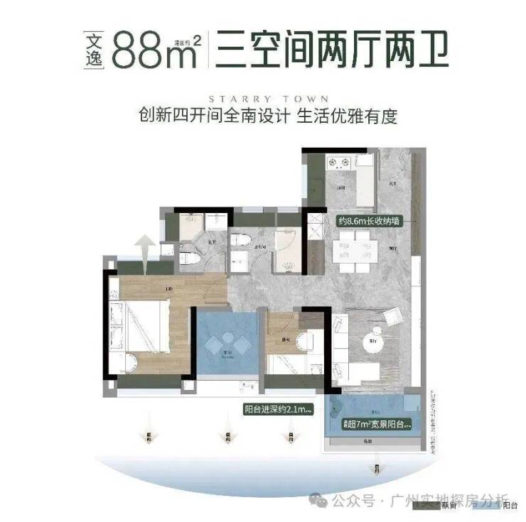 【88㎡ 3空间2厅2卫】三卧室朝南,超11米景观线