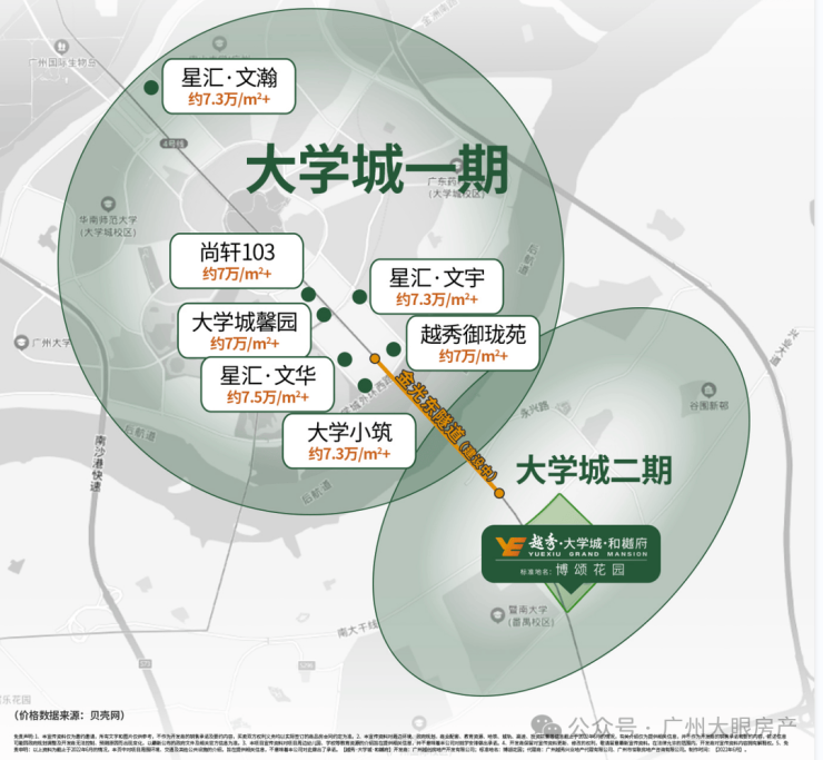 项目位于大学城二期-国际创新城板块,国际创新城共十平方公里,有暨南大学和广州医学院,整个创新城包括北翼的生物岛,核心的大学城和南翼的南岸起步区,南村地区,化龙地区,国际展贸城,在空间结构上形成了一核两翼。