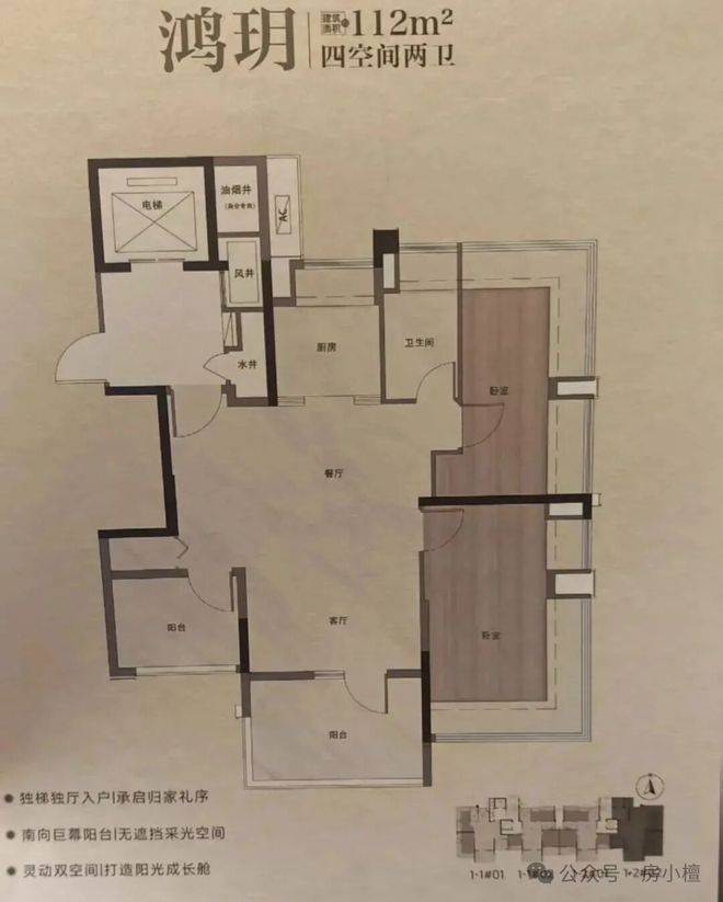 110㎡/112m²板楼四房:专梯专户+南北通透,南向面宽12.5米,私密性与舒适度双高;
