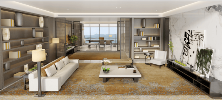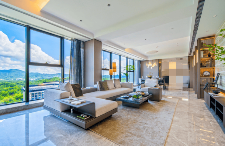 约108-293㎡宽境臻邸,天际峰层空间,约14.8mIMAX宽幕视野,环幕无遮挡一线山湖风光,最低1:1梯户比,尽显优雅尊崇的仪式感,府系精工,比肩国际标准,在每一处的选材都精挑细选,成就一代高奢居所。
