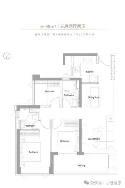 98㎡三房是南向设计,主卧带飘窗台,次卧能放下 1.5 米的床,阳台连接客厅和次卧,晾晒衣服不会影响客厅活动;