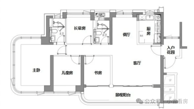 3梯4户设计。其中3栋是两梯两户大平层,建面约226平,是设计之都最大的户型。