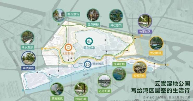 云鹭湿地公园作为整个云鹭片区绿芯,规划面积约66万㎡(990亩),对标国内外知名城央湿地公园(杭州西溪湿地、伦敦海德公园等),是全球首个城央鹭鸟主题湿地公园,依托大湾区密度最高的鹭鸟种群资源,打造国际大都市鸟类与人居环境协同共生的典范。