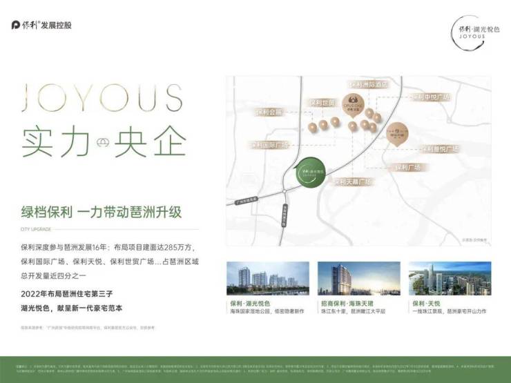 保利湖光悦色主打低密度生态居住体验,依托海珠湿地公园的天然优势,打造高端改善型滨水社区。作为海珠区内少见的现楼在售楼盘,该项目规划独梯独户设计,提高居住私密性。同时,保利作为央企房企龙头之一,具备成熟的高端住宅打造经验,湖光悦色在产品设计、品牌背书、资产安全性方面都具有一定优势。此外,作为广州CBD“珠金琶”黄金三角的一部分,琶洲板块的发展将进一步提升该区域的价值,未来潜力不容忽视。
