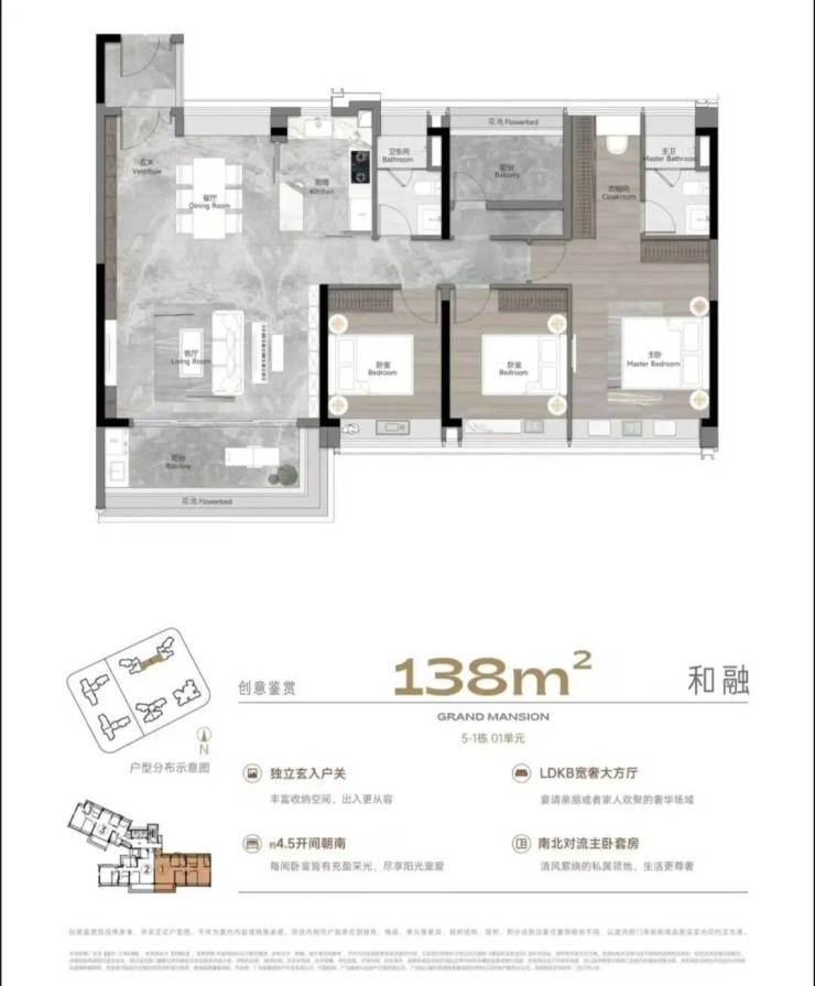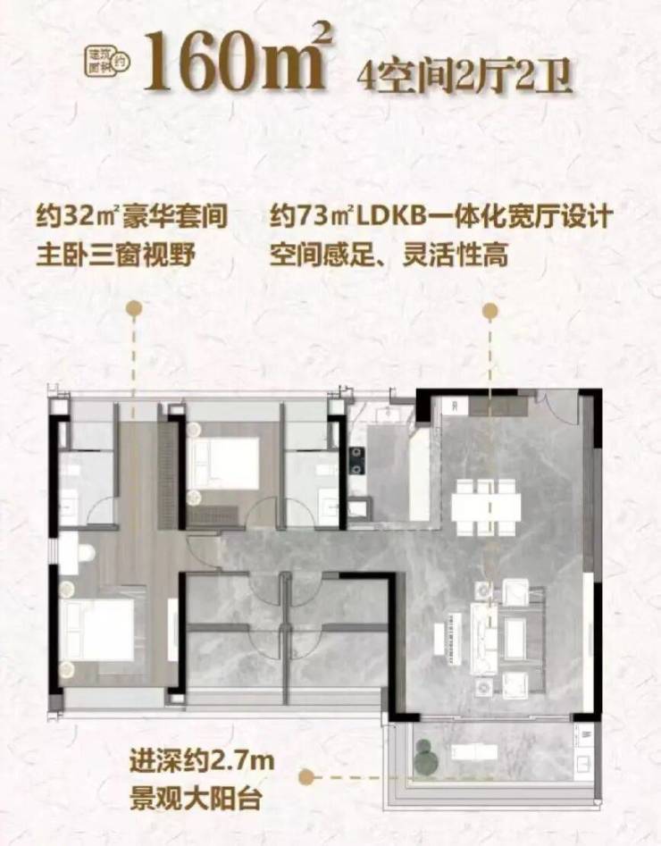 户型设计:主力户型为138-188㎡滨江四房,使用率约95%,部分户型拥有双面宽阳台、四开间朝南、南北对流等设计,采光和通风效果好。