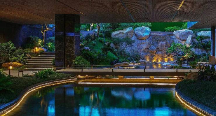 ——林荫景观会客厅沿用榕樾生活馆的爱马仕灰石材、香槟金铝板等经典元素,搭配灵动水景与原株移植斜飘紫花风铃木,呈现一处惬意的休闲空间。