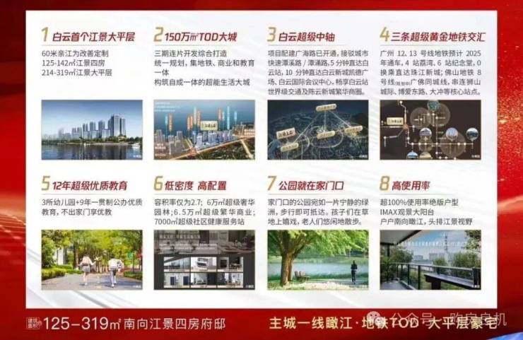 白云首个珠江大平层,125-142㎡南向江景4房,214-319㎡大平层,超高使用率,江景豪宅,市场罕有。[超高实用率]、[4面宽朝南看江]、[阳台宽达2.2米,高层长度8-9米,大平层长度17-24米]