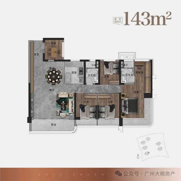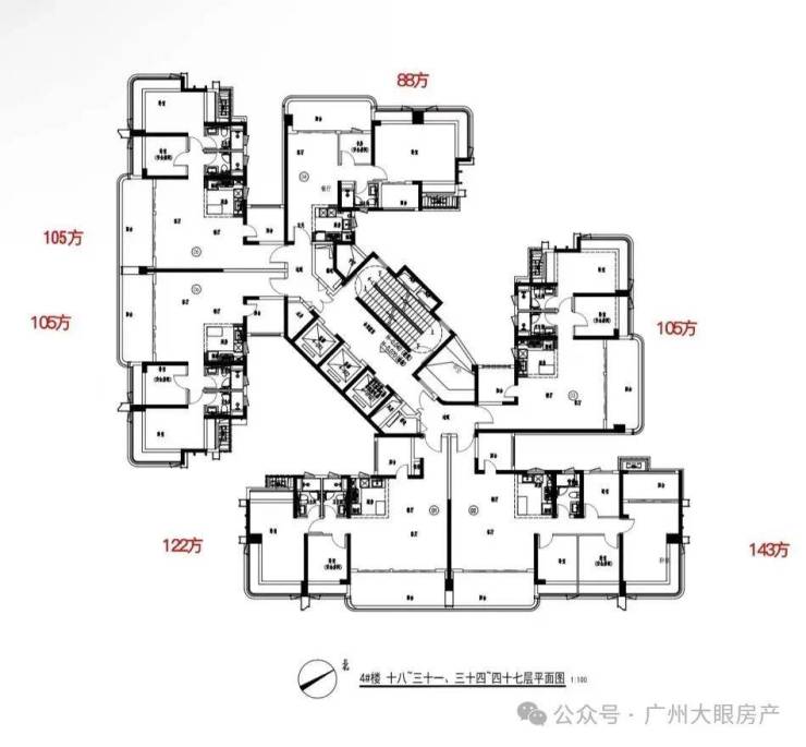 比如105平、122平、143平4开间朝南,其中朝南房间占比高达90%。